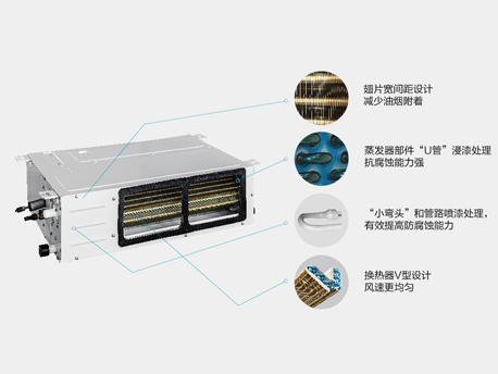 廚享內機采用金色防腐翅片換熱器,抗腐蝕能力強,翅片采用寬間距設計,可減少油煙附 著:換熱器采用V型設計,使風速更均勻。