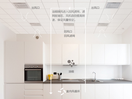 機組可智能檢測風口油煙臟堵程度,并自動匹配風機轉速,保證風量